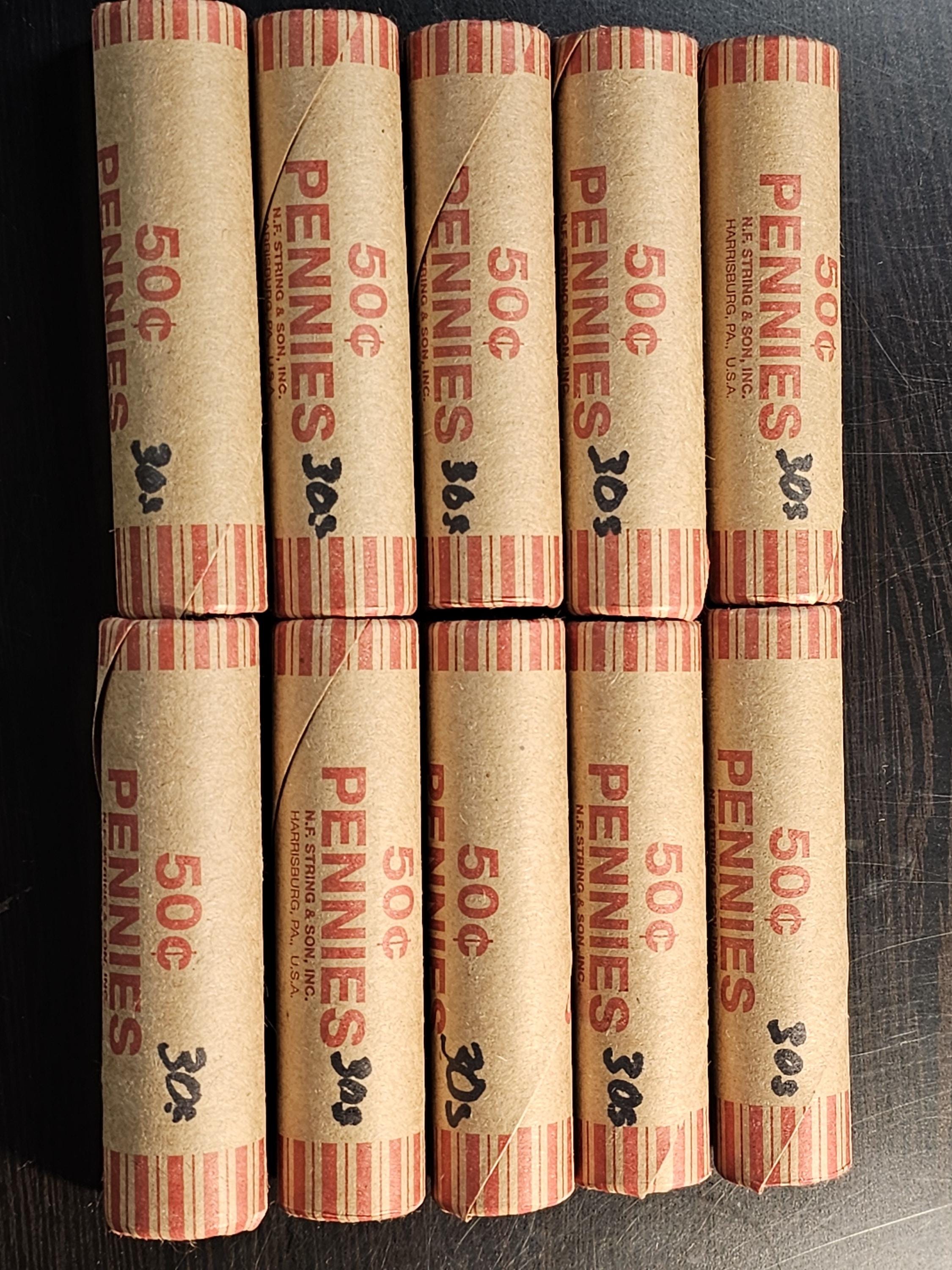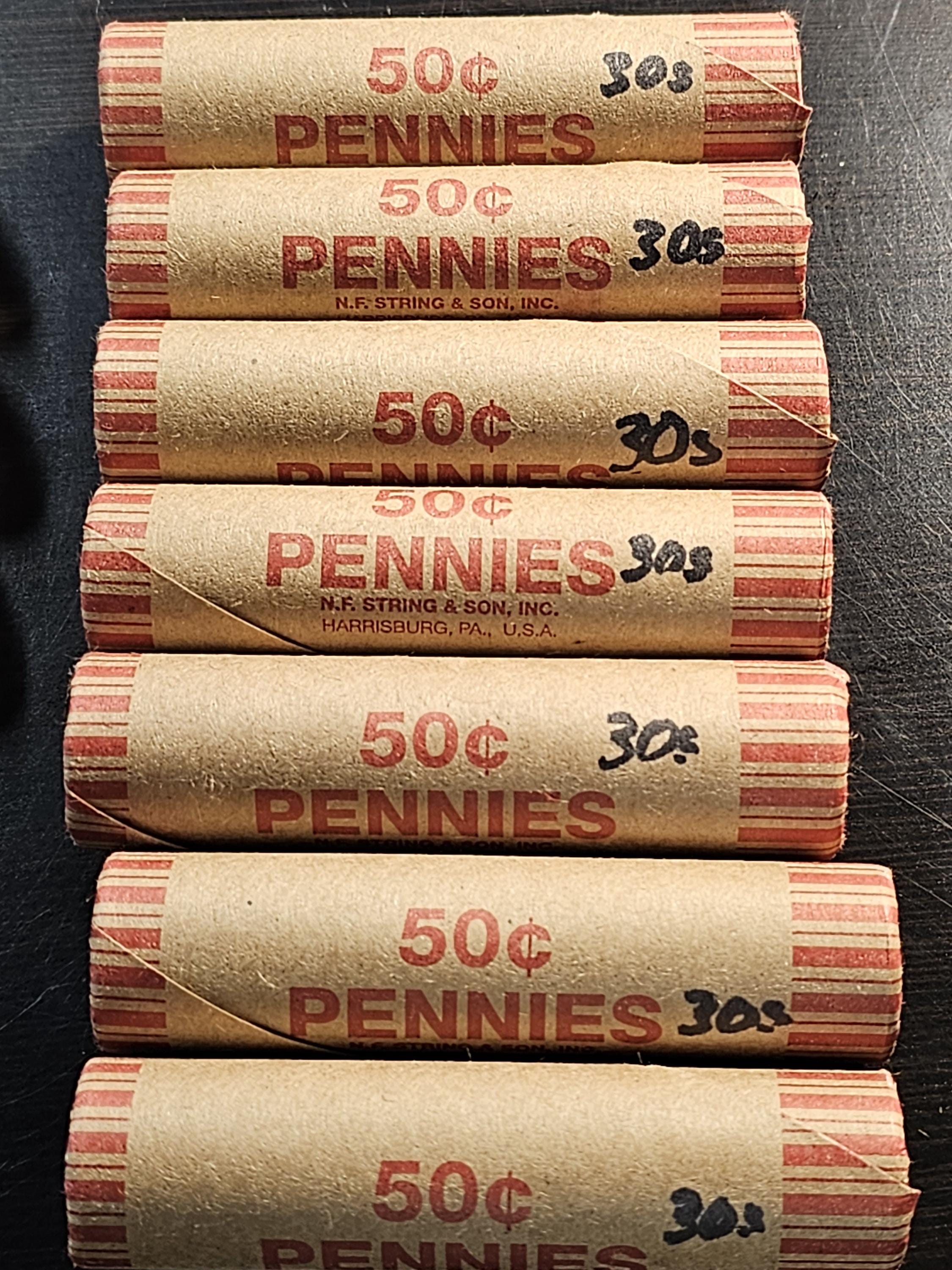 A roll of mixed 1930s wheat pennies is a collection of 50 circulated copper coins featuring Abraham Lincoln on the obverse and stalks of wheat on the reverse, with dates ranging from 1930 to 1939. These rolls are a popular way to start a collection and typically contain a mix of dates and mint marks (Philadelphia, Denver, and San Francisco), with varying conditions.