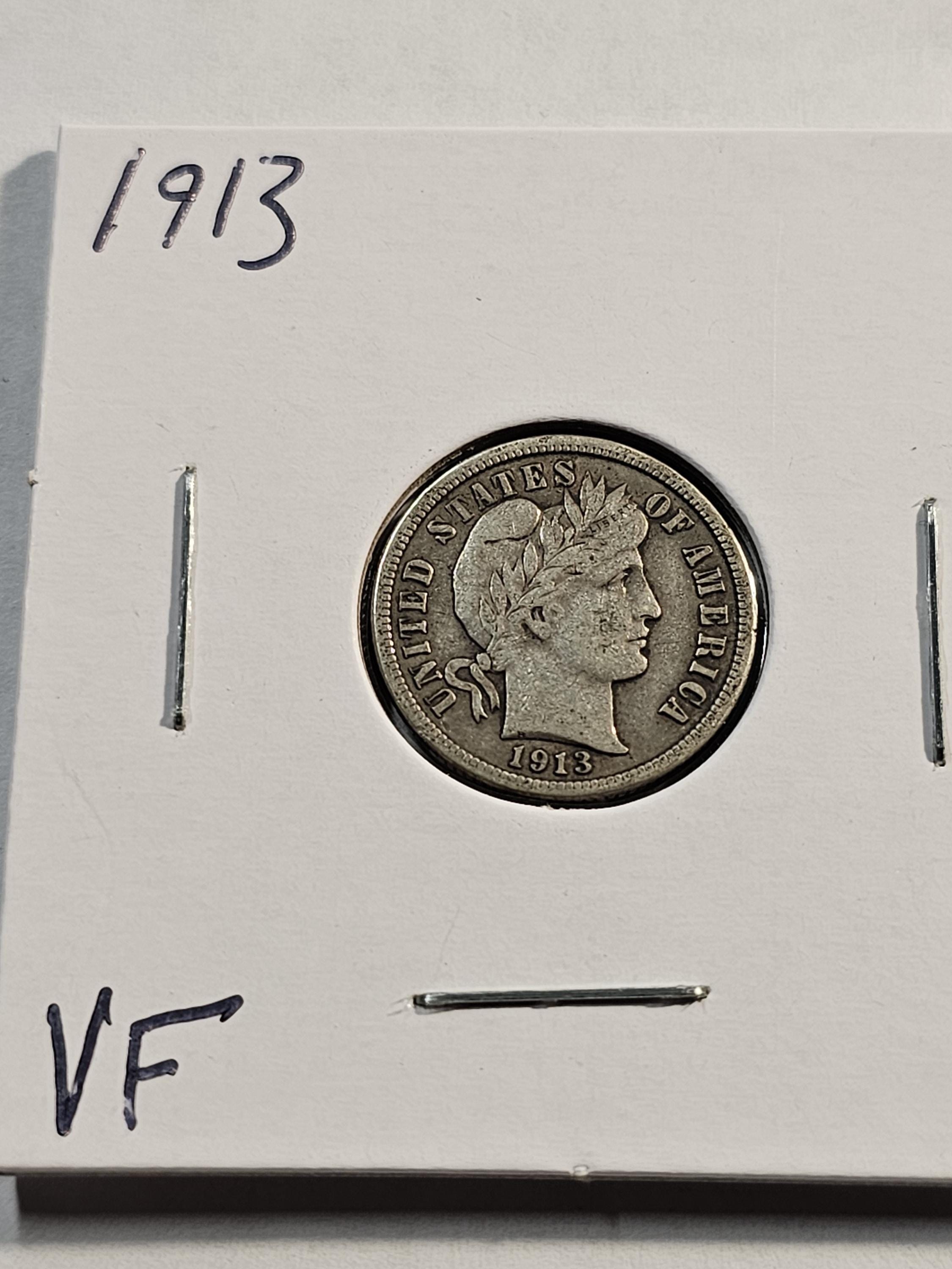Barber Liberty Head silver dimes, also called Barber dimes, are 90% silver coins minted from 1892 to 1916 and designed by U.S. Mint Chief Engraver Charles Barber. The obverse features a right-facing profile of Liberty wearing a cap and laurel wreath, while the reverse shows a wreath surrounding the words "ONE DIME". The design was shared with the quarter and half dollar of the same period and is considered Barber's masterpiece.